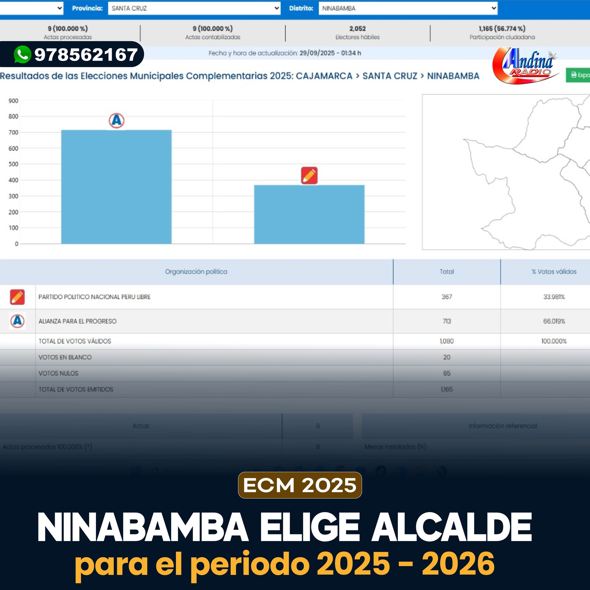 Esta madrugada la Oficina Nacional de Procesos Electorales ONPE, publicó los resultados de las elecciones complementarias municipales, realizadas en el distrito de Ninabamba en Santa Cruz.